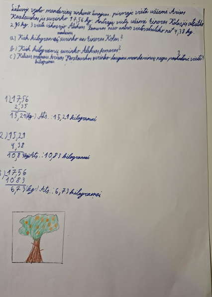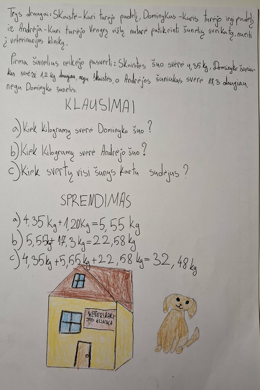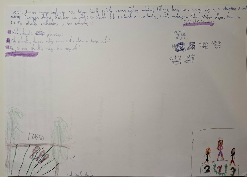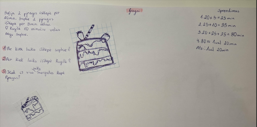 Mokiniai turėjo ne tik sukurti uždavinį, t.y. sugalvoti kontekstą, sukurti jam 3 klausimus, bet ir išspręsti jį, ir sukurti iliustraciją. Dirbo po tris grupėje. Ir visam šitam darbui buvo skirta vos 45 min.