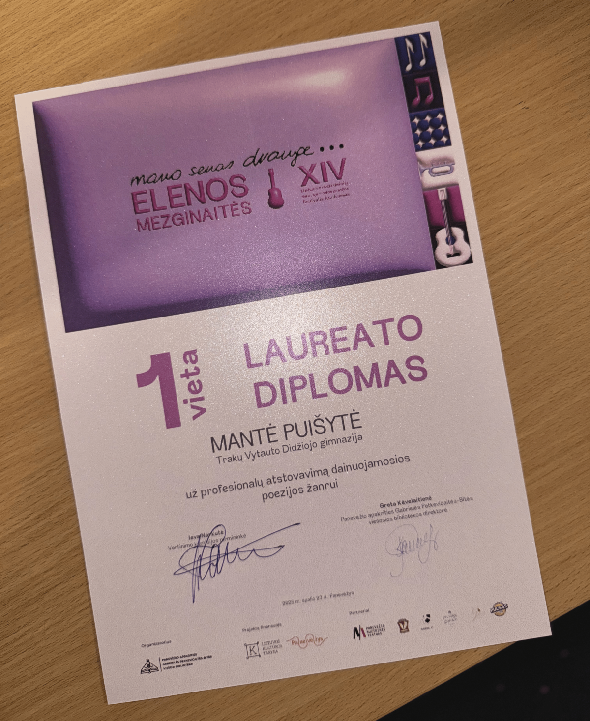 Šiame jautriame ir kūrybingame renginyje dalyvavo trečios gimnazinės klasės mokinė Mantė Puišytė, kurią paruošė mokytojas Klaidas Kajus Kauneckas. Mantė atliko du kūrinius - „Slenkstis“ ir „Groja fleita pavargęs žmogus“, pastarasis sukurtas pagal poetės Elenos Mezginaitės žodžius, muziką jam parašė pati Mantė.