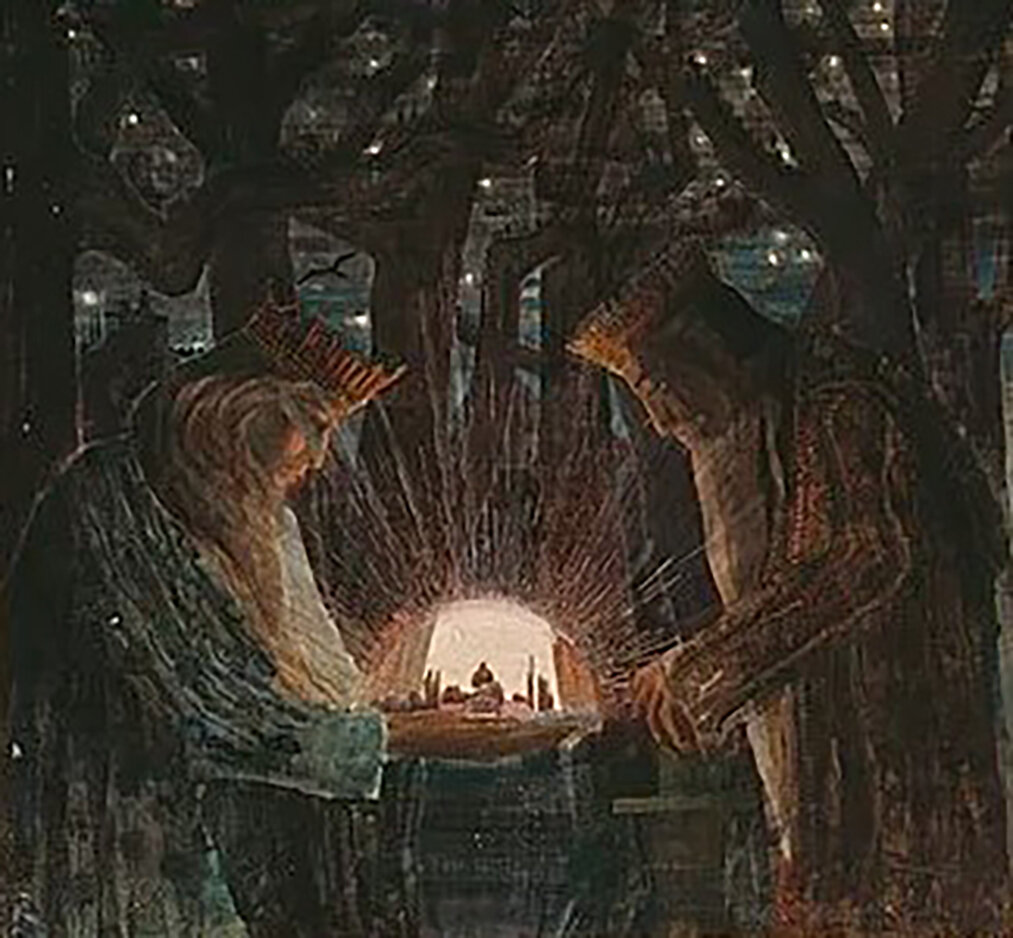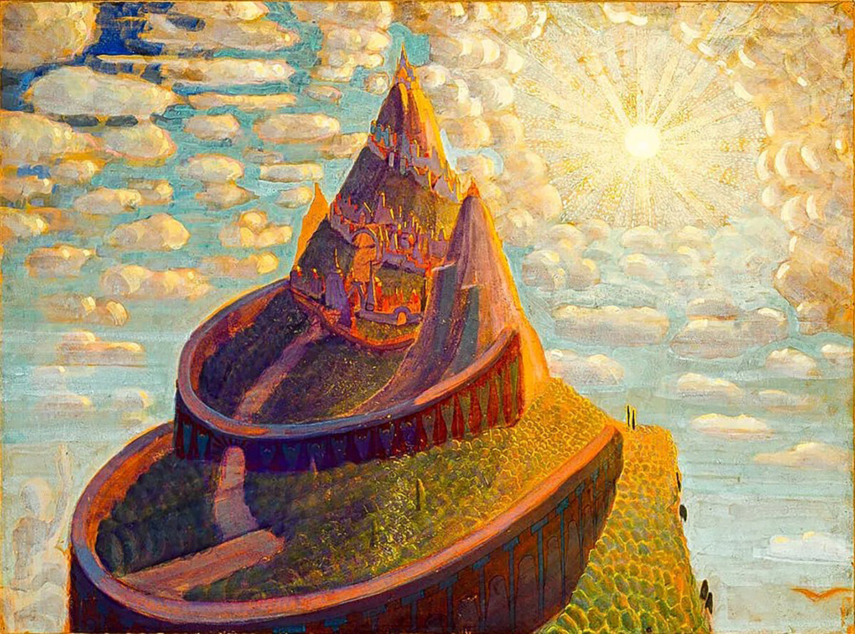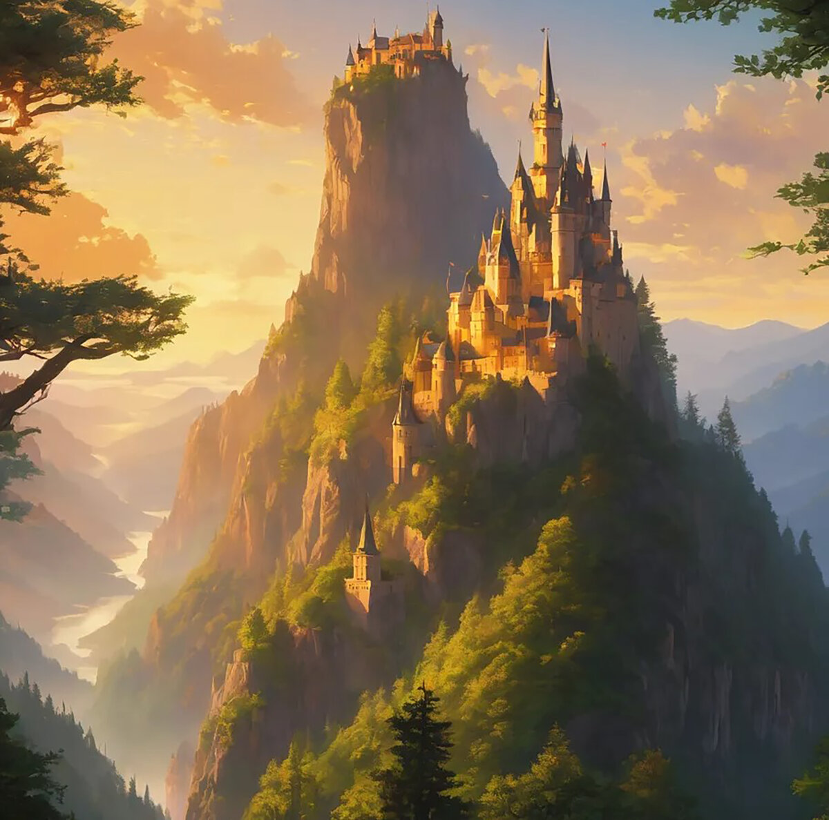 1c klasės gimnazistas Lukas Stašaitis analizavo Čiurlionio “Karalių pasaką“ bei sukūrė paveikslą “Sunset on a Calm Hill” taikydamas DI. Anot Luko, “The theme of the painting is a mix of mythology, spirituality, and imagination. The kings represent not only rulers but also guardians of wisdom and destiny. The glowing sphere may symbolize knowledge, life, or even the fragility of the human world, while the sword suggests protection, power, and responsibility.” 1c klasės gimnazistas Dominykas Tilindis detaliai angliškai apibūdino Čiurlionio paveikslą “Pilies pasaka” bei sukūrė vizualinę interpretaciją taikydamas DI.