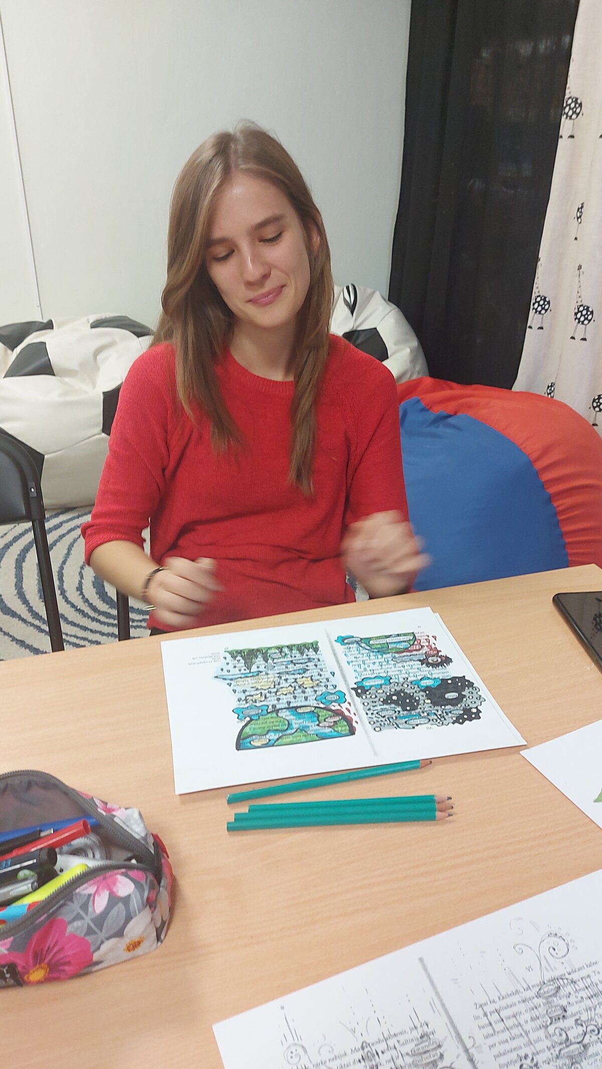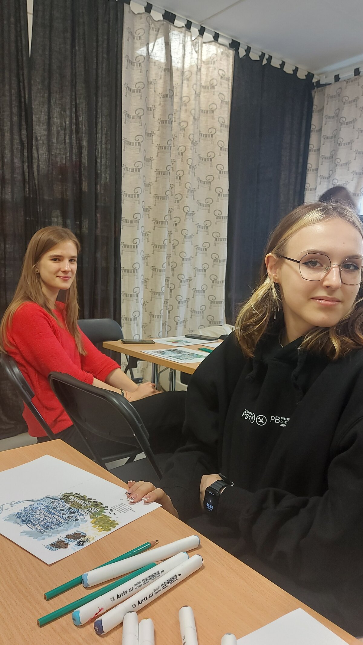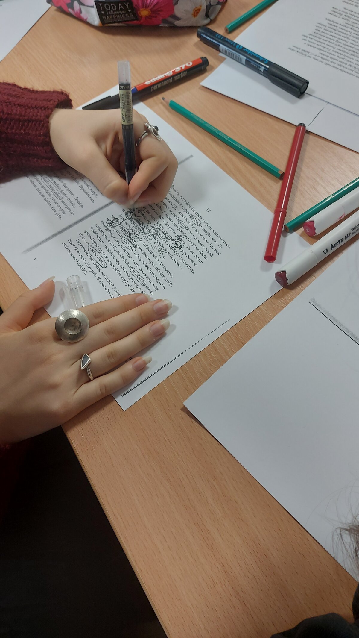 Per 1,5 val. mokiniai, perskaitę pasirinktas M. K. Čiurlionio knygos „Žodžio kūryba“ ištraukas, kūrė unikalią poeziją: atrinko žodžius, iš kurių norėjo sudėlioti savo tekstą, o kitus žodžius „užtemdė“ spalvomis, raštais, šešėliais. Paprasta, lengva? Taip. Ypač tada, kai įsigilini į Čiurlionio tekstą ir atrandi tuos ypatingus žodžius, kurie dabar tau atrodo patys reikalingiausi, kurie atskleidžia tave, tavo nuotaiką, jauseną, tavo asmenybę. O galbūt ieškai žodžių, padedančių tau pasislėpti, užsidėti kaip tik dabar reikalingą kaukę. Ši veikla – tai savotiška meditacijos forma, kai žodis ir spalva, piešinys, susilieję į visumą, leidžia nurimti, pabūti su savimi. Ir su draugais – juk esi ne vienas, šalia tavęs kuria poeziją bendraklasiai, todėl žvilgtelėti, kaip jiems sekasi, pašmaikštauti ar pasiskolinti reikiamos spalvos pieštuką – smagu.