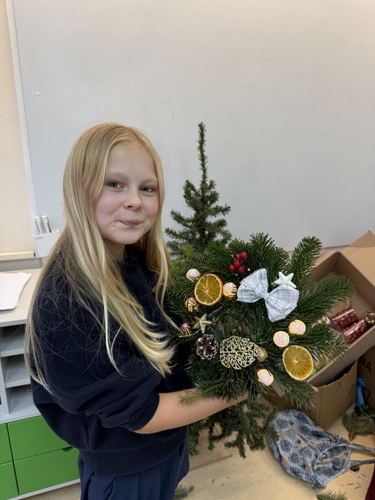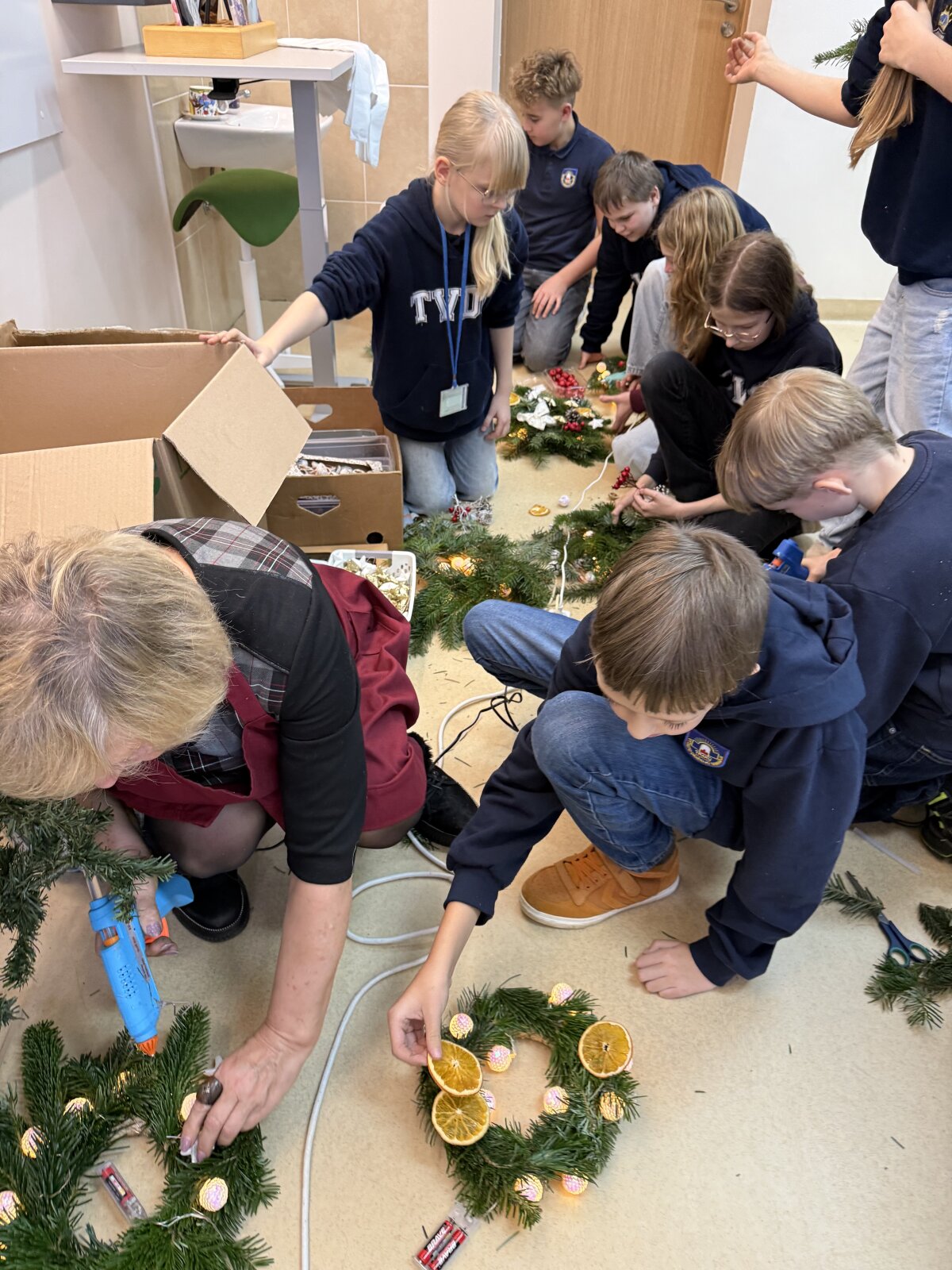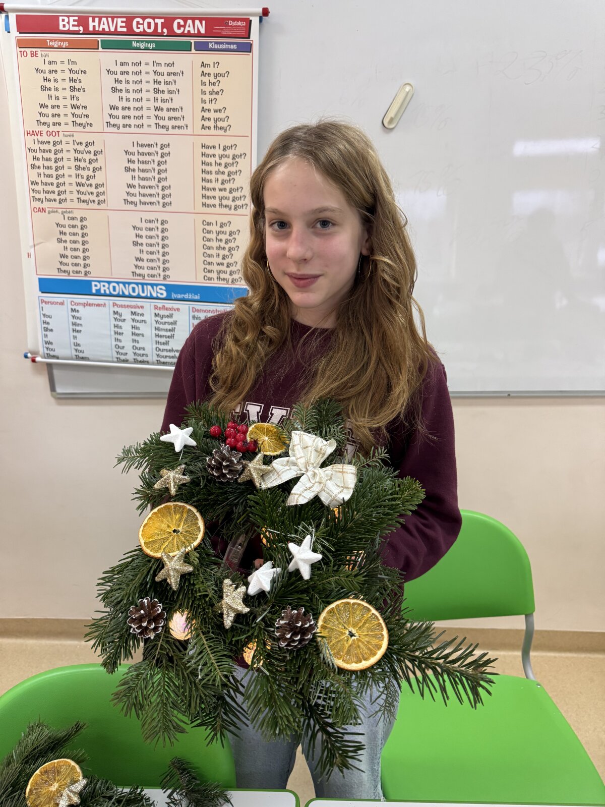 Vėliau prasidėjo pati smagiausia dalis – darbas. Ant suolų atsirado eglių šakelės, kankorėžiai, džiovinti apelsinai ir spalvotos juostelės. Kiekvienas galėjome pasijusti tikrais amatininkais. Kartais šakelės neklausė, kartais kankorėžiai krito ant žemės, bet juoko ir geros nuotaikos netrūko.