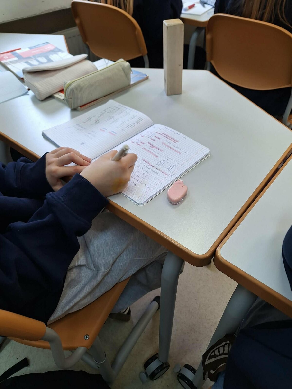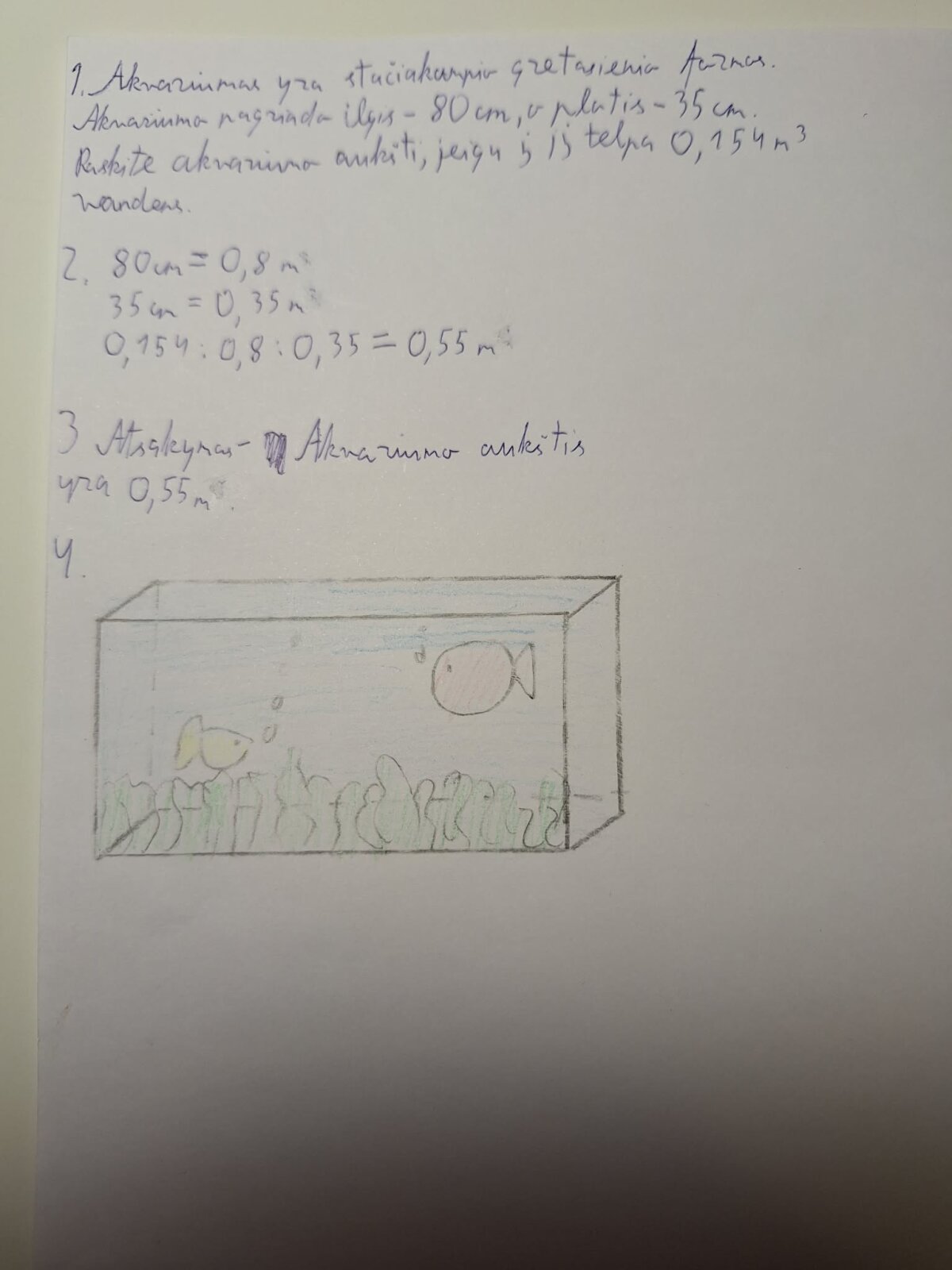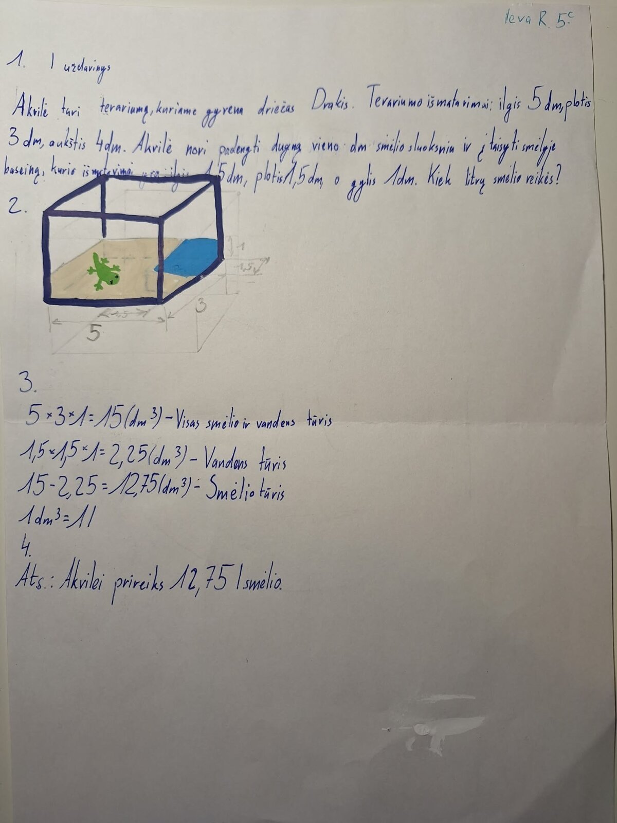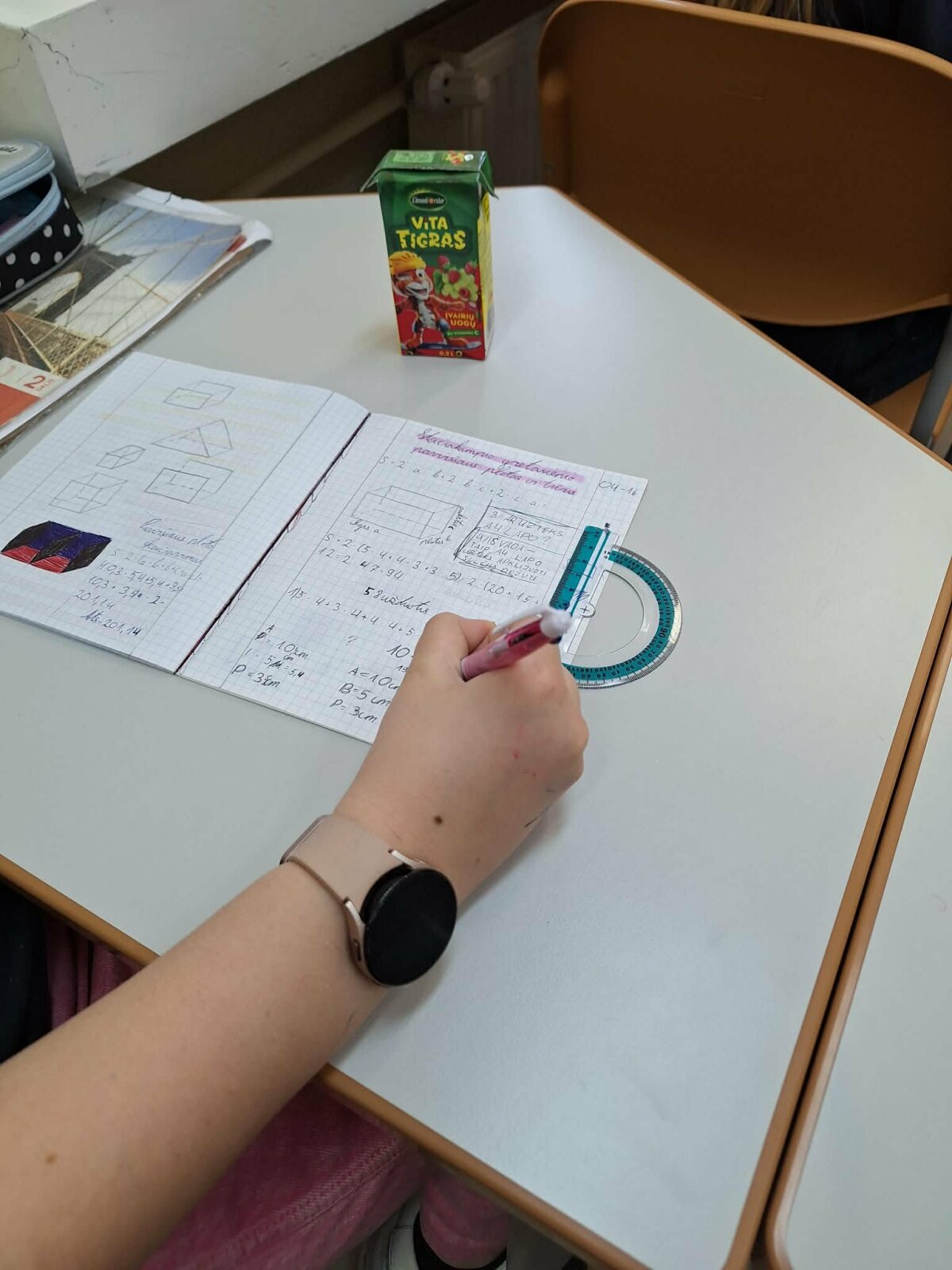 Per pirmą pamoką mokėmės stačiakampio gretasienio ploto ir tūrio skaičiavimo teorijos. Mokytoja aiškino, kokius veiksmus reikia atlikti norint sužinoti šios figūros plotą ir tūrį. Taip pat atidžiai skaitėme vadovėlyje pateiktą medžiagą. Kitai pamokai gavome itin neįprastą ir gana šmaikštų namų darbą – atsinešti išgertą mažų sulčių pakuotę.