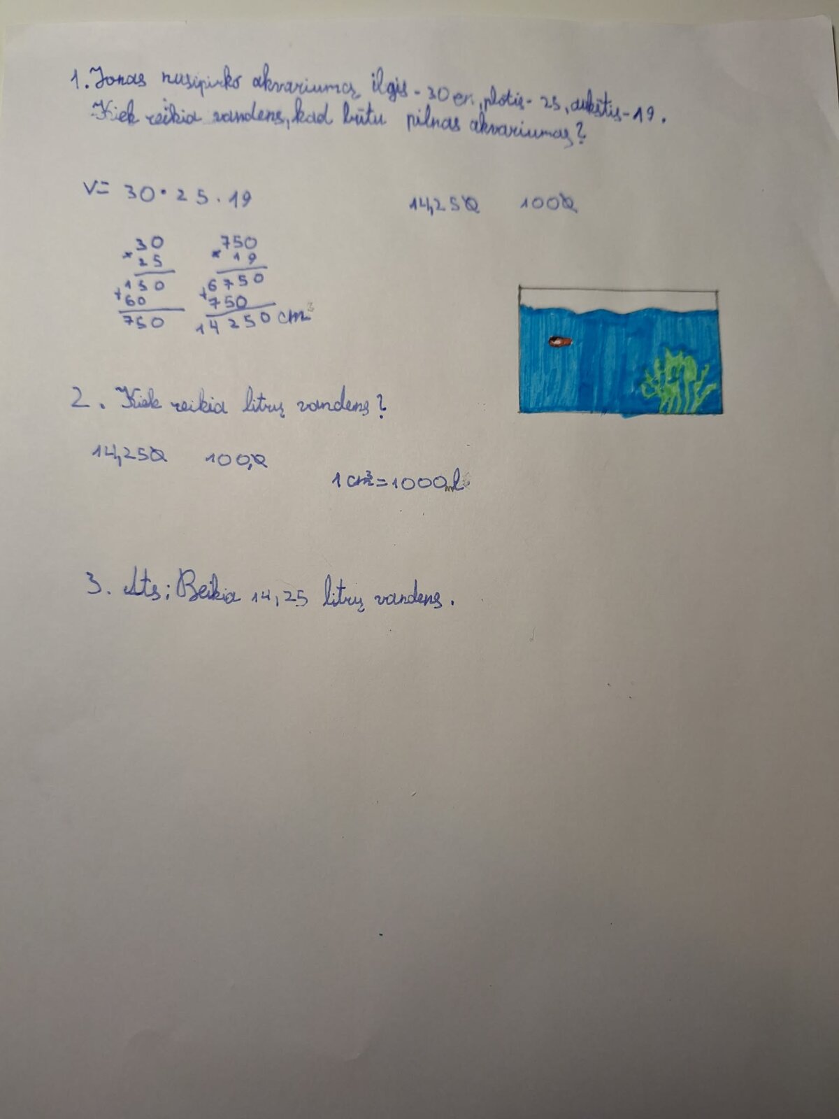 Antrą pamoką dirbome savarankiškai. Iš pradžių matavome atsineštų sulčių pakelių ilgį, plotį ir aukštį. Tada, atlikdami jau išmoktų veiksmų seką, apskaičiavome sulčių pakelio tūrį ir plotą. Kai skaičiavome sulčių pakelių tūrį, ieškojome atsakymo į iškeltą problemą: ar į tą mažą pakuotę sutilps 200 mililitrų? Skaičiavimai parodė, kad apytiksliai tiek ir telpa.