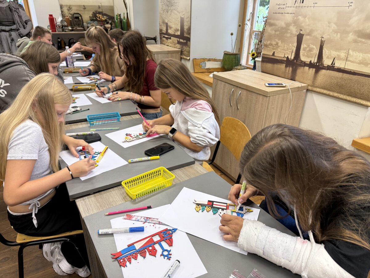 Pirmiausia aplankėme Kintus ir užsukome į Vydūno muziejų. Čia daug sužinojome apie E. V. Berbomą – intelektualą ir menininką, sukūrusį Pamario krašto žvejybos ženklus. Taip pat išgirdome pasakojimą apie vėtrungių atsiradimą. Po to patys gaminome vėtrungės magnetukus. Tai buvo smagi kūrybinė užduotis, kurią prisiminsime dar ilgai.