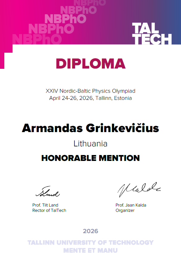 Balandžio 24-26 d. mūsų gimnazijos 4b klasės moksleiviai Armandas Grinkevičius ir Oleksandra Kabachenko turėjo puikią galimybę sudalyvauti Šiaurės Baltijos fizikos olimpiadoje (Nordic Baltic physics olympiad - NBPhO), Taline, Estijoje.